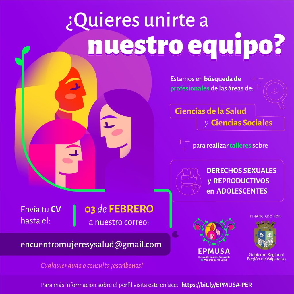 En el marco del Programa denominado «TRANSFERENCIA PROMOCIÓN DE LOS DERECHOS SEXUALES Y REPRODUCTIVOS DE ADOLESCENTES MUJERES CIS Y TRANS GÉNERO», financiado por el Gobierno Regional de Valparaíso y ejecutado por la Corporación Encuentro Permanente de Mujeres por la Salud, se requiere del servicio de Tallerista para la ejecución del programa. Te invitamos a revisar el siguiente enlace: para conocer más acerca de las funciones a desarrollar.